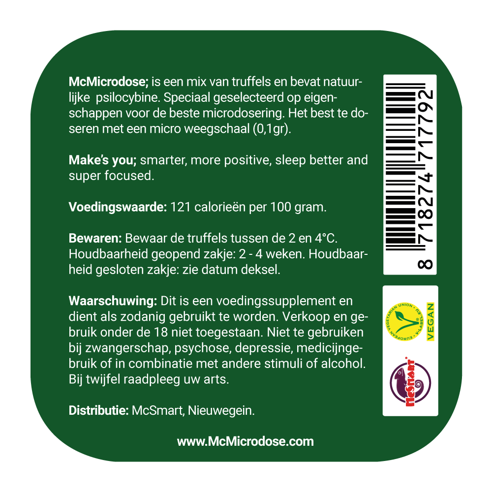 McMicrodose is een mix van truffels en bevat natuurlijke psilocybine. De mix is speciaal samengesteld op basis van de beste eigenschappen voor microdosing. Microdoseren was nog nooit zo betrouwbaar en effectief!
